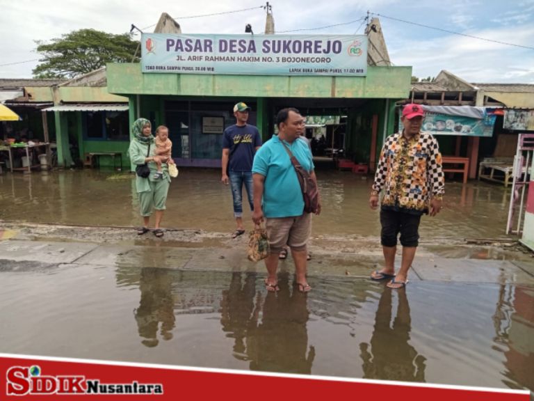 Kondisi tergenangnya Pasar Desa Sukorejo tergenang banjir akibat hujan deras sore kemarin,sehingga, aktivitas jual beli di pasar sempat terganggu,hal ini membuat para pedagang lesehan harus mencari lebih tinggi dari genangan air.