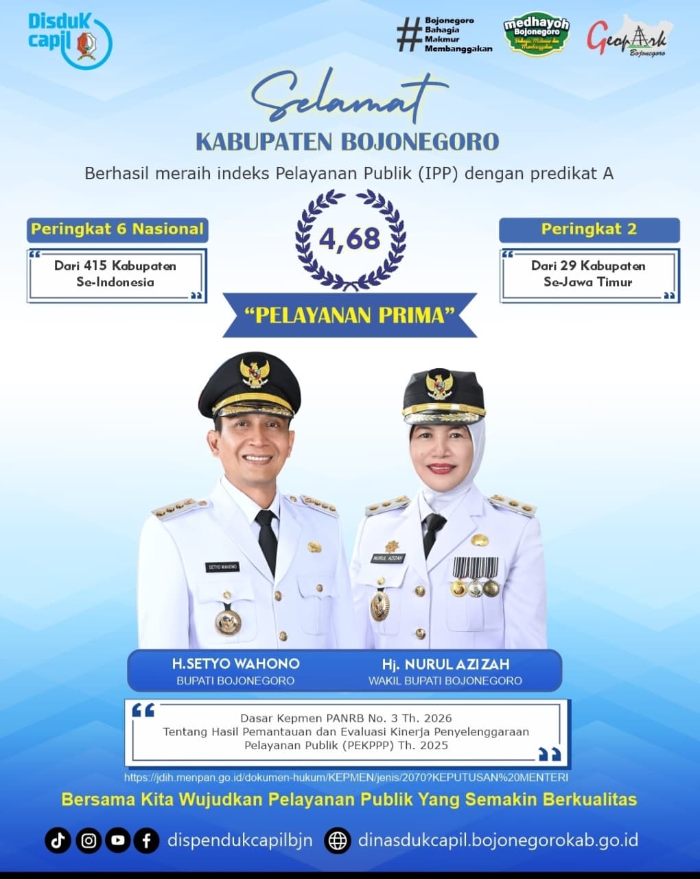Capaian ini menjadi bukti nyata komitmen dan konsistensi Pemkab Bojonegoro dalam menghadirkan pelayanan publik yang berkualitas, profesional, dan berorientasi pada kepuasan masyarakat.