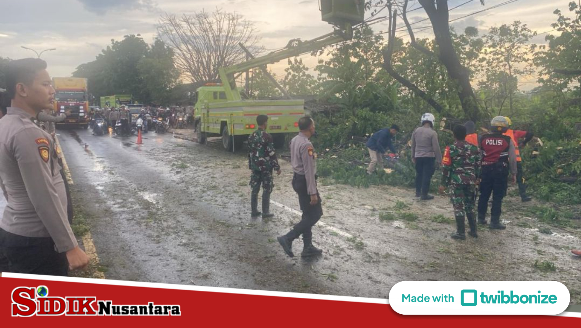 Petugas bergotong royong memotong dan menyingkirkan batang pohon yang melintang di jalan, sekaligus melakukan pengaturan arus lalu lintas guna mencegah terjadinya penumpukan kendaraan.