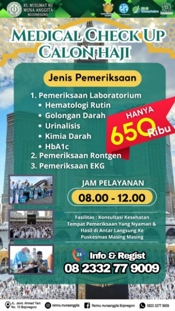 Bagi Calon jamaah haji yang ingin melakukan medical check up haji dapat mendatangi secara langsung ke RS Muslimat NU Muna Anggita atau menghubungi layanan informasi rumah sakit untuk mendapatkan jadwal dan persyaratan lengkap. Dengan pelayanan yang cepat, profesional, dan terstandar, rumah sakit ini siap menjadi mitra kesehatan bagi calon jamaah dalam mewujudkan perjalanan ibadah yang aman dan penuh keberkahan. (Red)