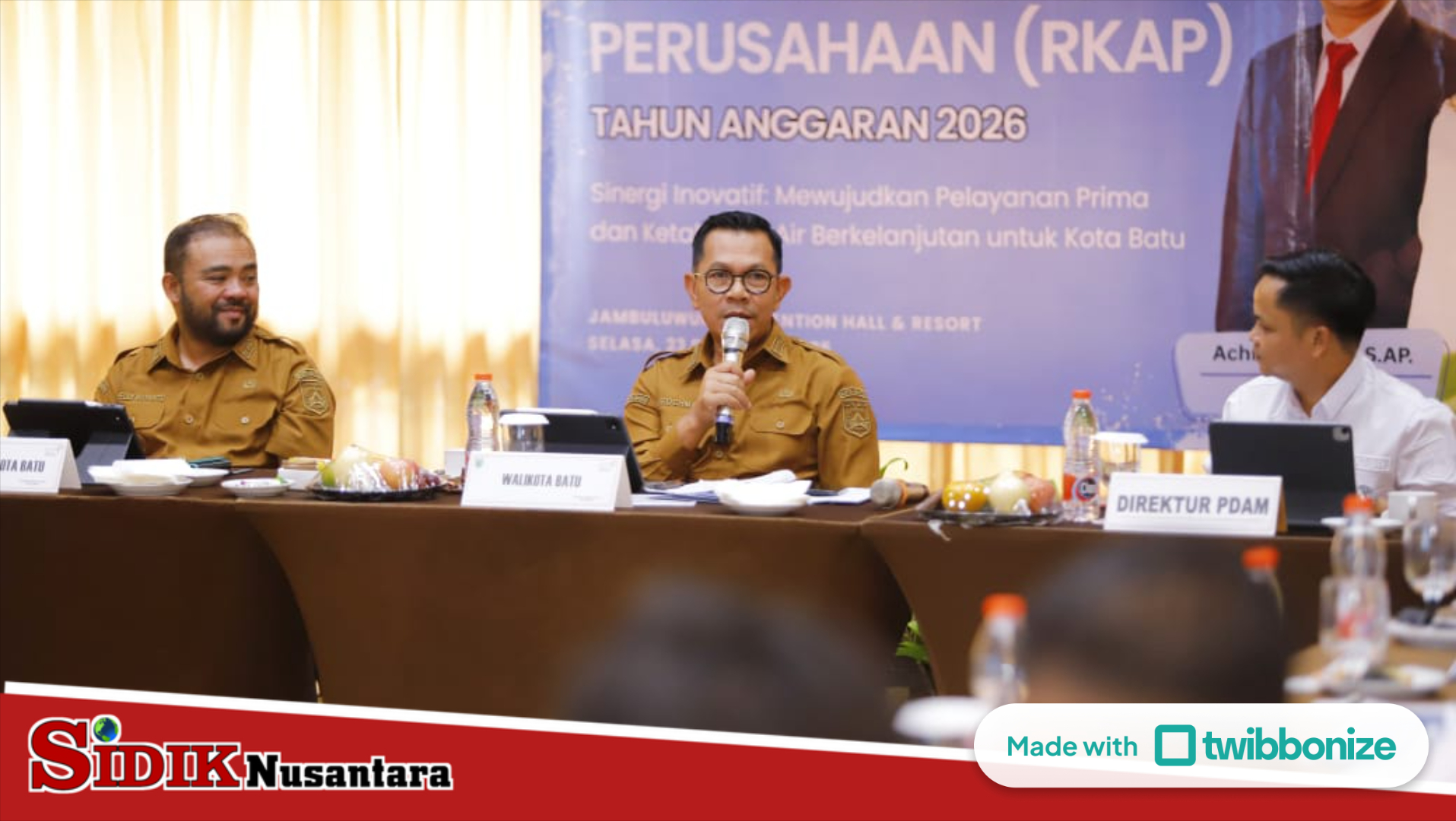 BATU,Sidik Nusantara – Wali Kota Batu Nurochman bersama Wakil Wali Kota Heli Suyanto menghadiri kegiatan Penyampaian Rencana Kerja dan Anggaran (RKA) Perusahaan Umum Daerah Air Minum (Perumdam) Among Tirto Kota Batu sebagai forum strategis penyelarasan arah kebijakan perusahaan daerah dengan prioritas pembangunan layanan air bersih Pemerintah Kota Batu, di Kota Batu, Selasa (23/12/2025).