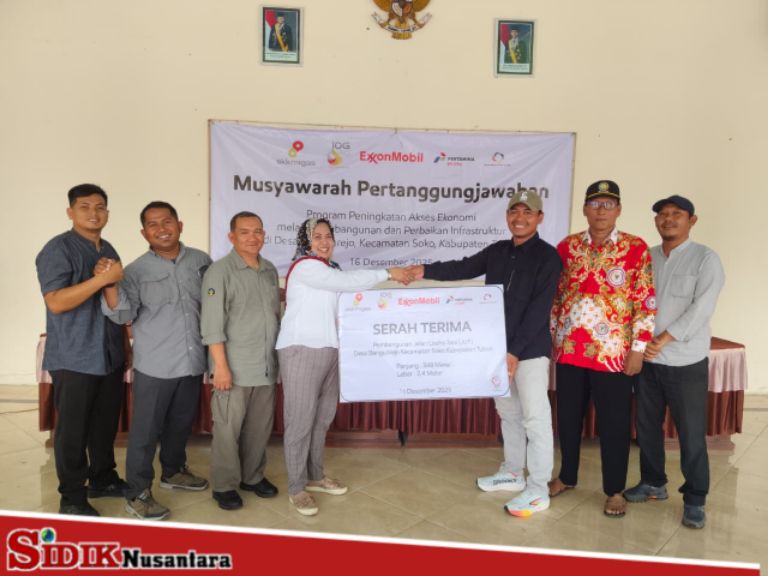 Bojonegoro, sidik nusantara – Pemerintah Desa Kalirejo, Kecamatan Bojonegoro, Kabupaten Bojonegoro dan Desa Bangunrejo, Kecamatan Soko, Kabupaten Tuban, pada Selasa (16/12/ 2025) meresmikan hasil Program Peningkatan Akses Ekonomi melalui Pembangunan dan Perbaikan Infrastruktur yang didukung oleh ExxonMobil Cepu Limited (EMCL). Program ini dijalankan dengan pendampingan Forum Studi Pengembangan Potensi Daerah (FOSPORA) dan dilaksanakan secara gotong royong oleh masyarakat desa. Peresmian dilakukan melalui Musyawarah Pertanggungjawaban dan Serah Terima Infrastruktur yang digelar di balai desa masing-masing. Acara tersebut dihadiri oleh pemerintah desa, Badan Permusyawaratan Desa (BPD), perwakilan EMCL, tim pendamping FOSPORA, tokoh masyarakat, serta warga penerima manfaat.