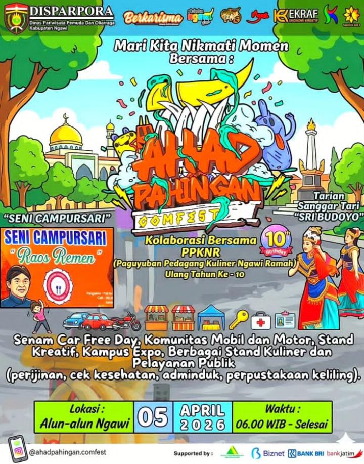 Wiwin Purwaningsih Kepala Dinas Pariwisata Pemuda dan Olahraga dalam menyampaikan bahwa Ahad Pahingan Comfest 2026 merupakan upaya mengenalkan potensi wisata di Ngawi oleh Disparpora, dan sejak pertama digelar pada Februari 2024 yang lalu, antusias masyarakat sangat luar biasa dan terus meningkat.